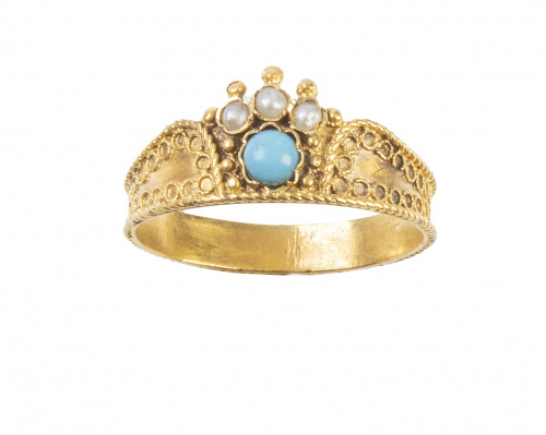 Sortija S. XIX con coronita de turquesa y perlitas, adornada con filigrana