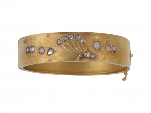 Brazalete rígido de pp. S. XIX con diamantes de talla rosa que componen formas florales, combinados con sutil dibujo grabado