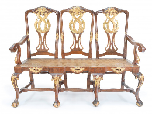 517. Banco de respaldo triple de madera de nogal tallado y dorado.