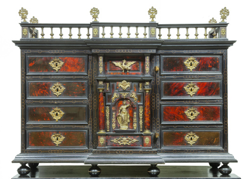 Papelera de frente arquitectónico de madera ebonizada, carey y latón.