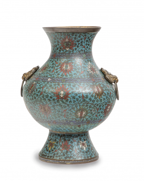 1220. Jarrón "hu" en esmalte cloisonné azul decorado con hojas de loto.