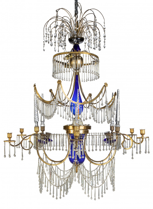 1323. Lámpara de seis brazos y catorce luces de estilo neoclásico en bronce y cristal traslúcido y azul.