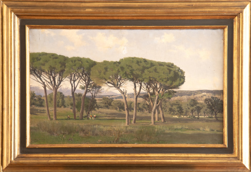 En nuestro paisaje, realizado al natural, mediante una pincelada ligera, pero detallada en planos oblicuos, el pintor nos describe la densa vegetación del lugar mediante los pinos en primer lugar seguido de abundantes encinas y al fondo la sierra. También lo humaniza colocando a los personajes del lugar, pastor con rebaño pastando o el piñero con el burro recogiendo piñas y nos muestra edificaciones como la casa blanca al fondo a la derecha. Era frecuente que Beruete pintara esta zona, son muchos los paisajes desde el Plantío de los Infantes desde 1883 hasta el final de sus días, ya que la finca era del abuelo de su mujer, MªTeresa Moret y Remisa. Se conoce correspondencia con su amigo íntimo, Sorolla, sobre su trabajo allí: "Yo voy todas las tardes al campo (Plantío de los Infantes)".