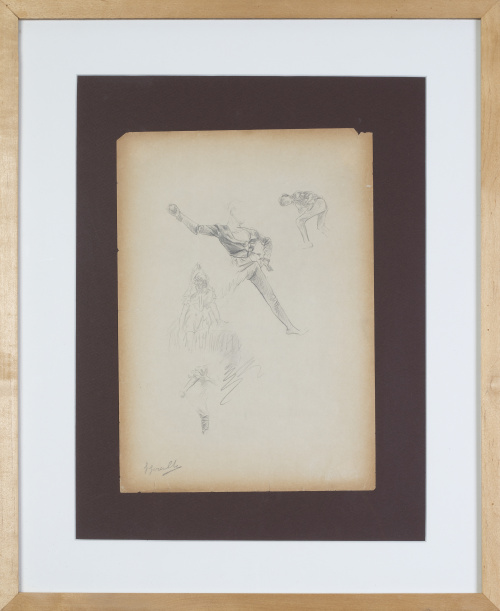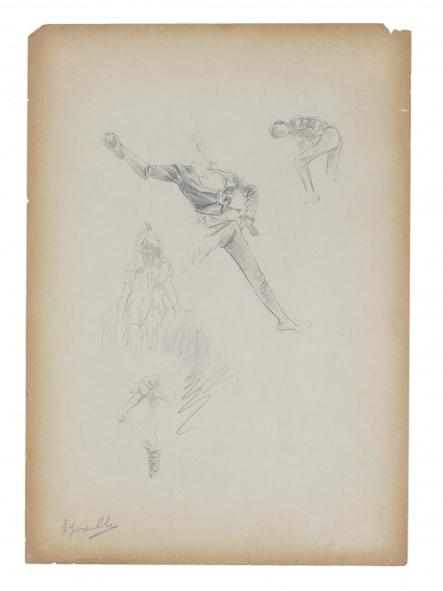Este estudio de figuras para el cuadro El padre Jofré protegiendo a un loco, es similar a otro procedente de la colección Pedro Gil Moreno de Mora, pero contiene una figura más, la del joven agachado cogiendo piedras.