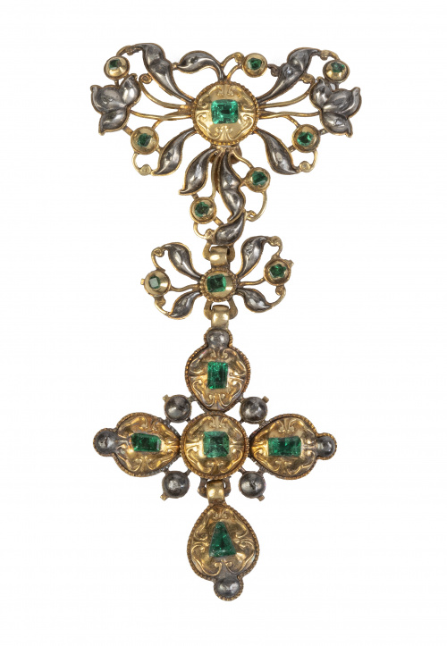 Venera colgante popular S. XVIII de esmeraldas y diamantes, con cruz adornada con dos lazos superiores
