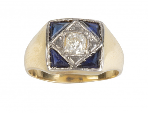 105. Sortija Art-Decó tipo sello con brillante central en marco de rombo y rombo exterior de zafiros