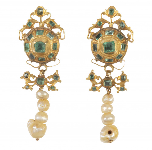 12. Pendientes largos populares S. XVIII-XIX con esmeraldas en rosetón del que pende un lazo y línea colgante de perlas finas de tamaño creciente