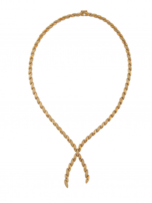 257. Collar con frente cruzado, de piezas ojivales de oro mate y brillo alternas