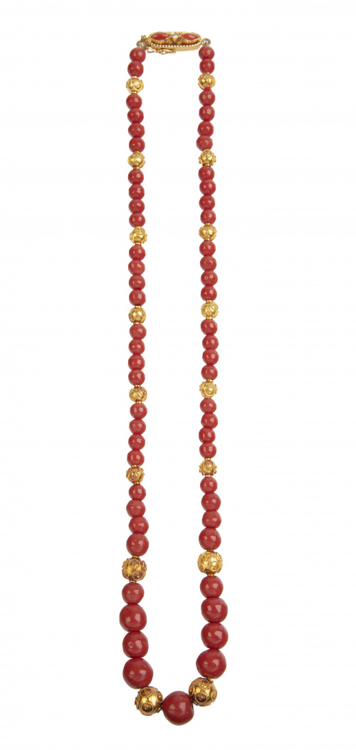 265. Collar portugués de esferas de coral combinadas con esferas de oro decoradas con filigrana, de tamaño creciente hacia el centro