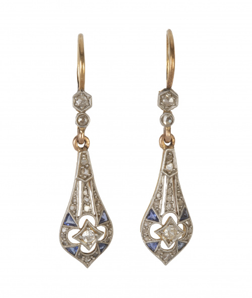 295. Pendientes Art-Decó punta de flecha de diamantes y zafiros con decoración calada