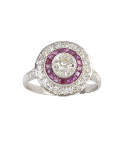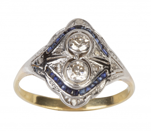 Sortija Art-Decó con diseño de rombo lobulado, con dos chatones de brillantes en el frente y borde de zafiros calibrados