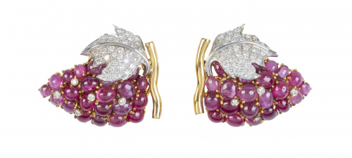 311. Pendientes de estilo retro con diseño de racimo de uvas de cabuchones de rubíes, combinados con chatones de brillantes con hoja de parra de brillantes