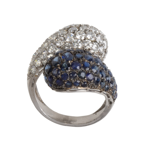 Sortija cuajada de brillantes y zafiros en dos brazos bombée que se unen en el frente