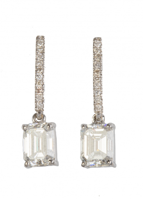 331. Pendientes largos con diamante talla esmeralda de 0,93 ct cada uno, que penden de barra arqueada de brillantes
