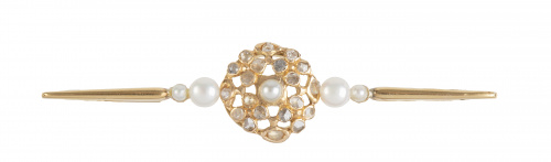 35. Broche alfiler de ff S.XIX con rosetón central de diamantes y perla central, flanqueado por dos perlas