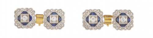 Gemelos dobles Art-Decó con dos piezas cuadradas caladas con brillantes centrales, zafiros y diamantes , con borde lobulado.