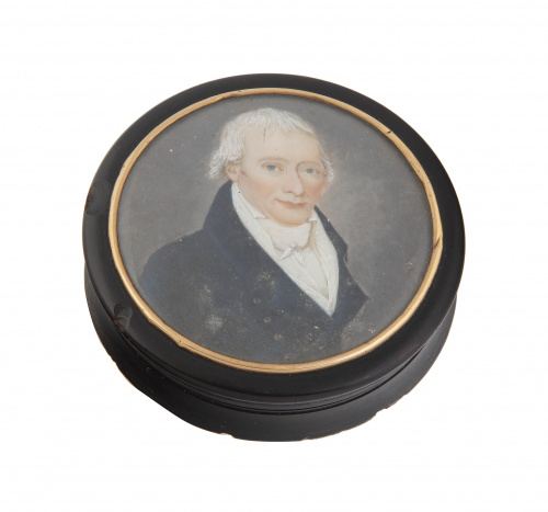 Caja circular de carey S.XVIII con miniatura de caballero con marco de oro liso