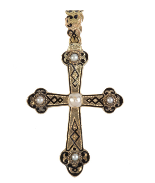 40. Cruz colgante de pp S. XX con perlas en el centro y cada extremo lobulado, con decoración esmaltada en negro