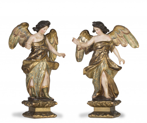 Pareja de ángeles lampadarios en madera tallada, dorada y policromada y esgrafiada.