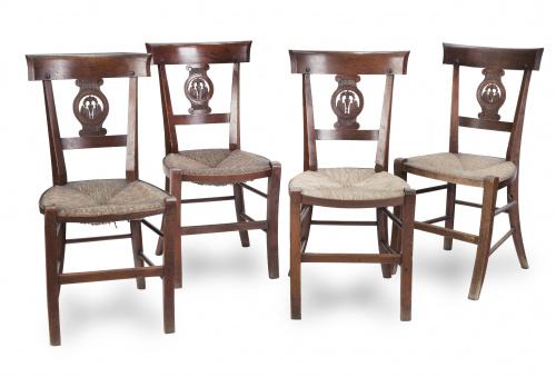 Juego de ocho sillas en madera de caoba con asiento de enea.