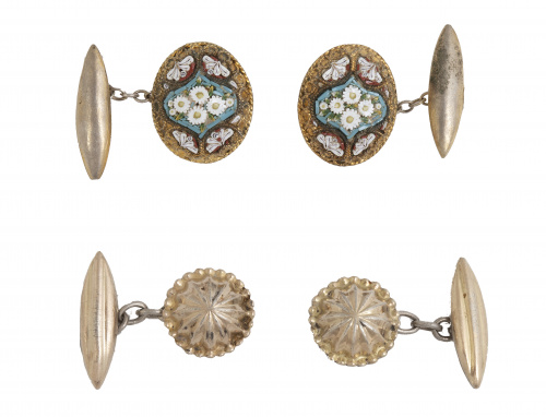 52. Lote de dos parejas de gemelos de pps. S. XX en plata dorada, unos con micromosaico otros con botón en relieve
