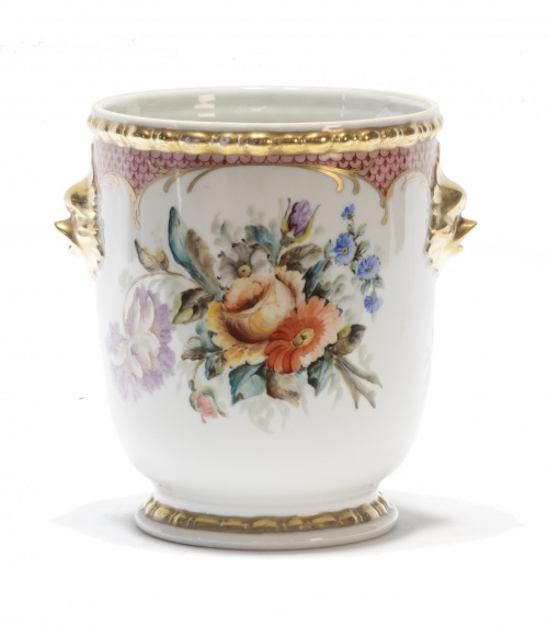 Home / SUBASTA JUNIO 2022 / Macetero de orla rosa en porcelana esmaltada y dorada con b