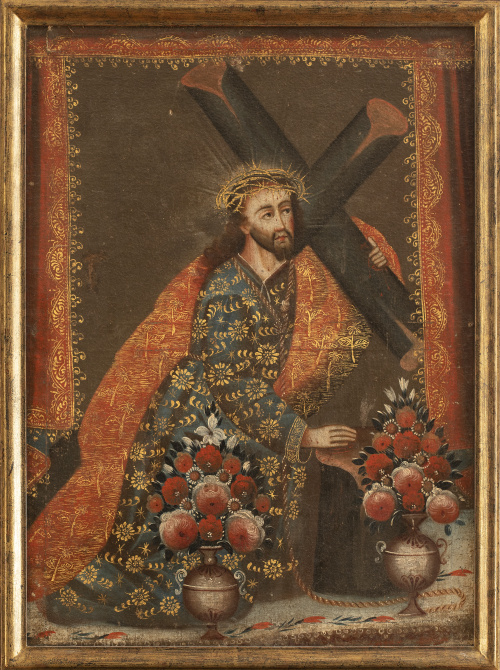 Sobre una mesa de altar decorado con dos jarrones de zinnias, flores nativas de américa, el pintor nos sitúa en el centro de la composición a Cristo en el momento que tropieza camino al Calvario. Sobre su hombro izquierdo porta la cruz y con su mano derecha se apoya sobre un pedestal. La figura de Jesús, se presenta sin sentimentalismos, pero podemos apreciar su sufrimiento aparente en las líneas faciales, así como en las heridas con sangre que brota de su rostro y de sus manos. El lienzo, está ricamente engalanado con adornos en brocado que cubre de forma extensiva la túnica, el manto de Cristo y el cortinaje que la rodea.