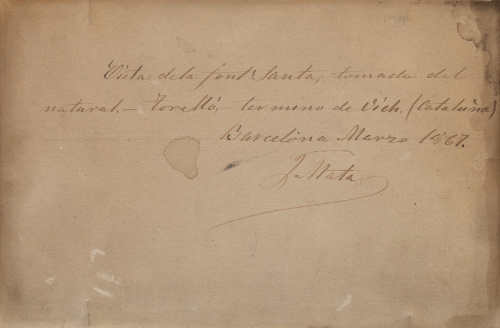 Firmados e inscritos al dorso: Vista de la font Sanrta tomada del/natural. Torelló término de Vich (Cataluña)/Barcelona Marzo 1867/ J. Mata;