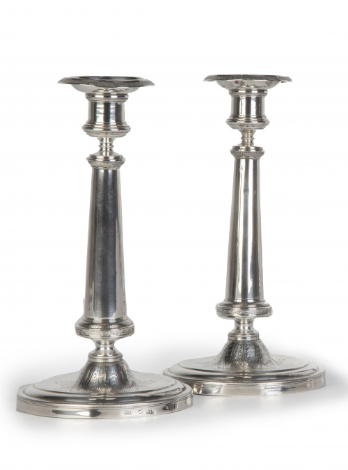 Pareja de candeleros de plata con decoración grabada de hojas. Con marcas.