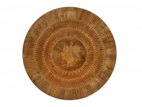 690. Velador de madera de nogal con marquetería geométrica de maderas finas, representando a San Jorge en el centro.