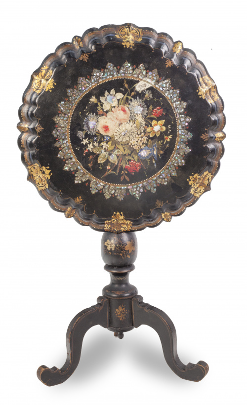 698. Mesa "til-top" en papier mâche con incrustaciones de nácar y ramillete pintado.