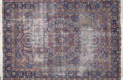 Alfombra en lana de campo granate y azul con cartuchos, cenefa decorativa en azul con palmetas.