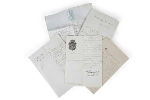 Acompañan cinco cartas dirigidas a su persona, fechadas entre 1849 y 1870, tres de ellas con sellos oficiales.