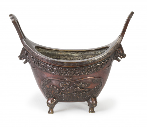 Incensario de bronce, con cartelas decorativas, rematado por meandros cuadrados en la boca.