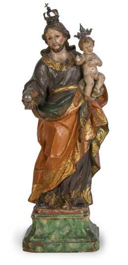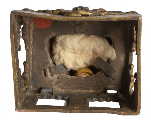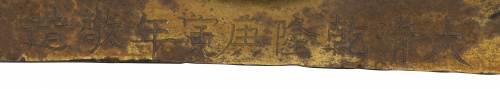 Con marcas en varias partes, lleva inscripción en la base que reza:  "hijo sexto". Estas piezas se encargaron para conmemorar el sexagéismo cumpleaños del emperador. Ejemplos similares en: Chan Fundation, Taipei, Buddhist imagen in gilt metal, Taipei, 1993, núm 21.