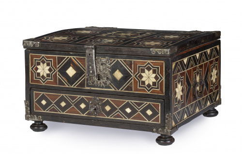 Caja de palosanto y hueso, con herrajes metálicos y cerraduras de hierro recortado con forma de águilas bicéfalas.