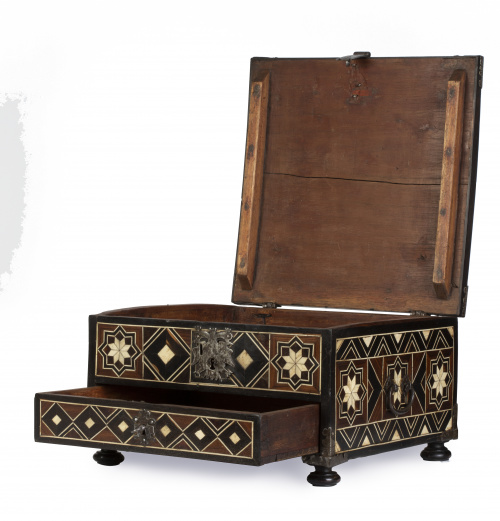 Con tapa superior y cajón. Interior albergando diversos compartimentos.