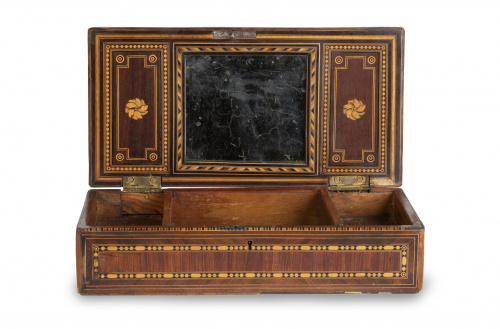 Decoración de marquetería geométrica neoclásica, albergando cajones secretos en el interior.
