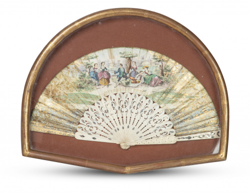 Abanico con país con escena galante y varillaje de hueso con incrustaciones de nácar.