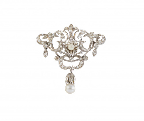 108. Broche historicista de pp. S. XX de formas vegetales con diamantes y perlas que componen frente triangular