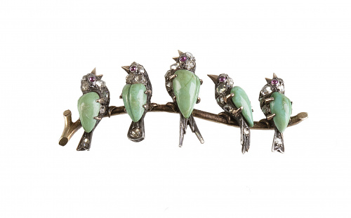 Delicado broche de pp. S. XX con cinco golondrinas de turquesa y diamantes con ojos de rubíes