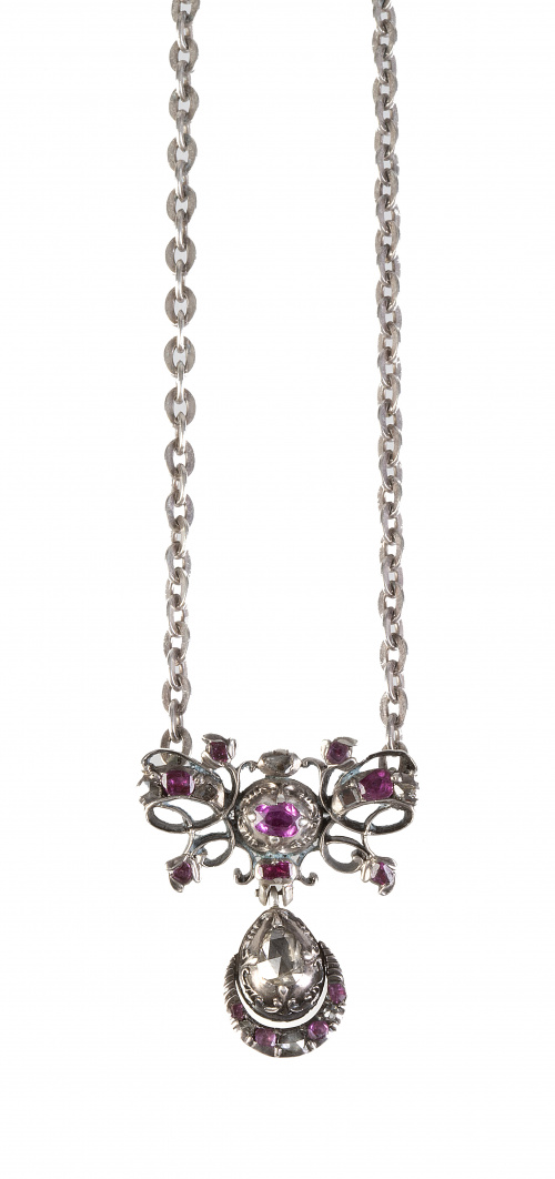 135. Colgante S. XVIII-XIX con lazo de rubíes y perilla de diamante talla rosa colgante en montura de plata