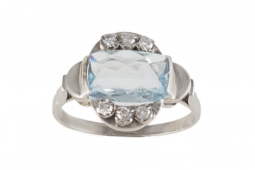 140. Sortija con aguamarina y trío de brillantes en la parte superior e inferior