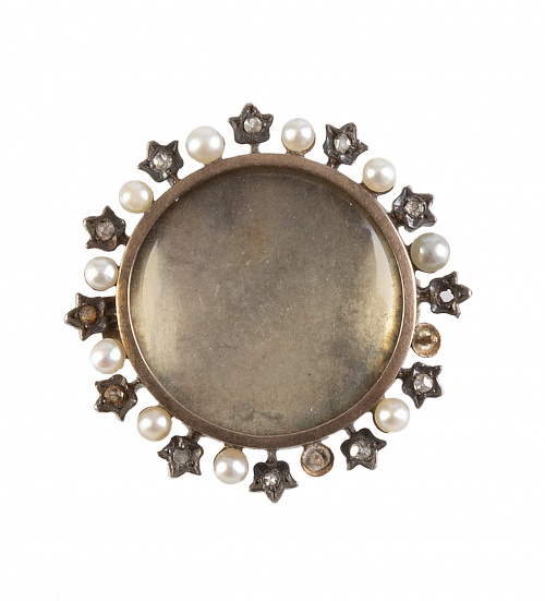 Broche portafotos circular S. XIX con marco de perlas alternas con estrellas adornadas con diamante central