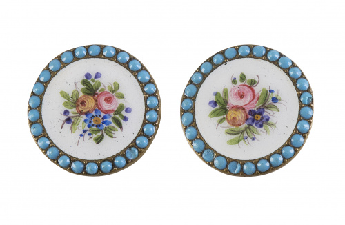18. Pareja de botones circulares de esmalte de pp. S. XX con flores policromadas sobre fondo blanco orladas de puntos de esmalte turquesa