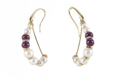 225. Pendientes largos con arcos de perlas combinadas con rubíes esféricos y brillantes