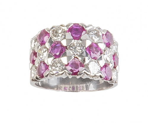 Sortija ancha de rubíes y brillantes alternos a modo de damero