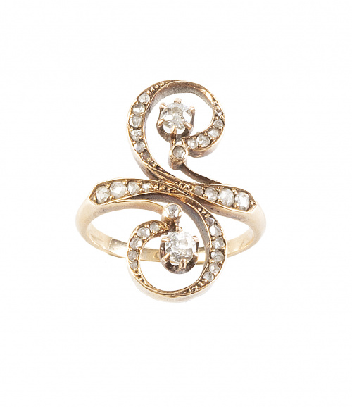 27. Sortija lanzadera c.1900 con dos centros de brillante de talla antigua entre líneas sinuosas de diamantes