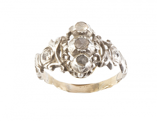 28. Sortija lanzadera S. XIX con tres diamantes talla rosa y decoración labrada en los brazos de la montura 0,300