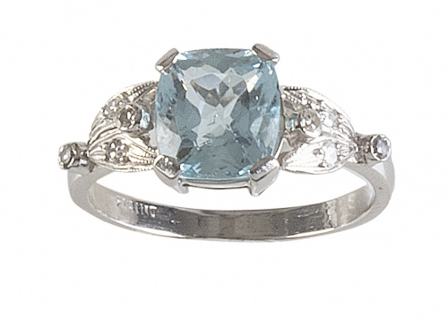 284. Sortija con aguamarina cuadrangular con hojitas de brillantes a los lados